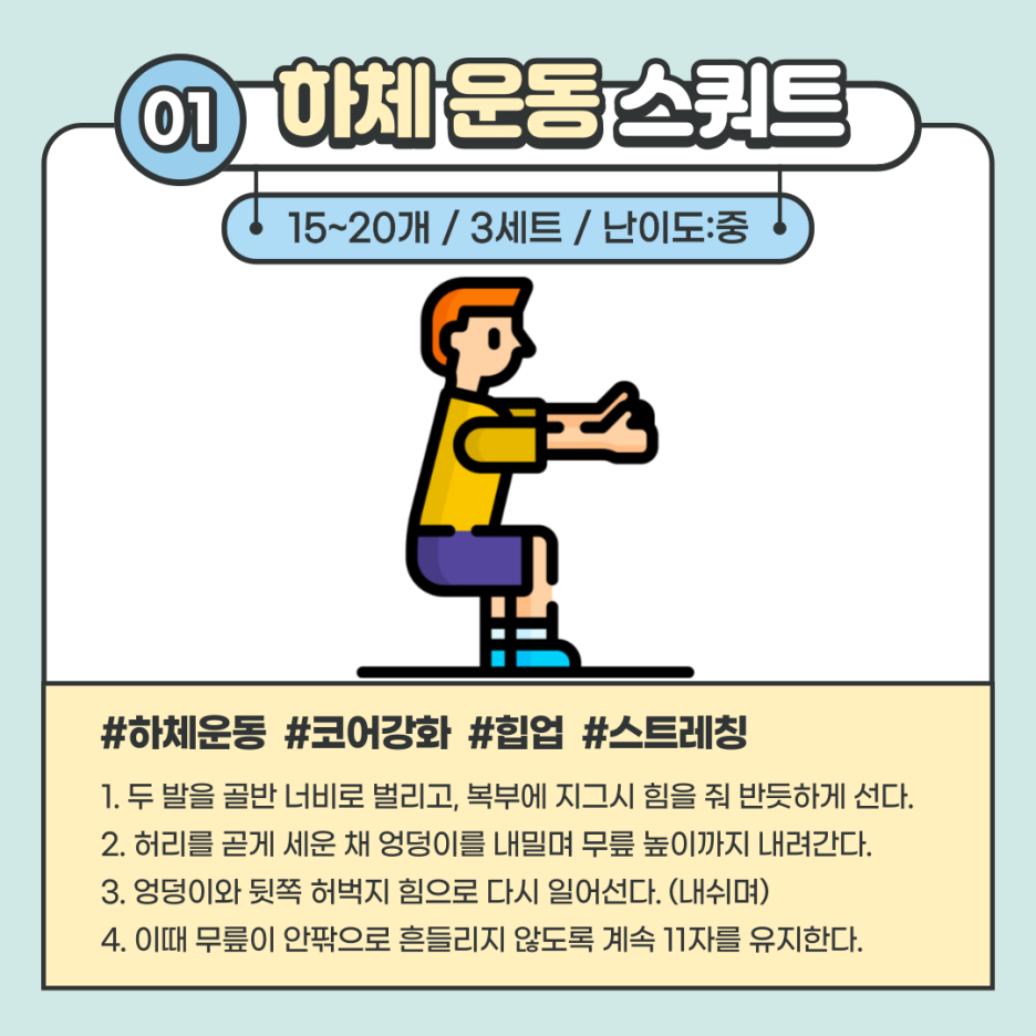 - 베이직 스쿼트에서 다리를 최대한 넓게 벌리고 실행해야 합니다.