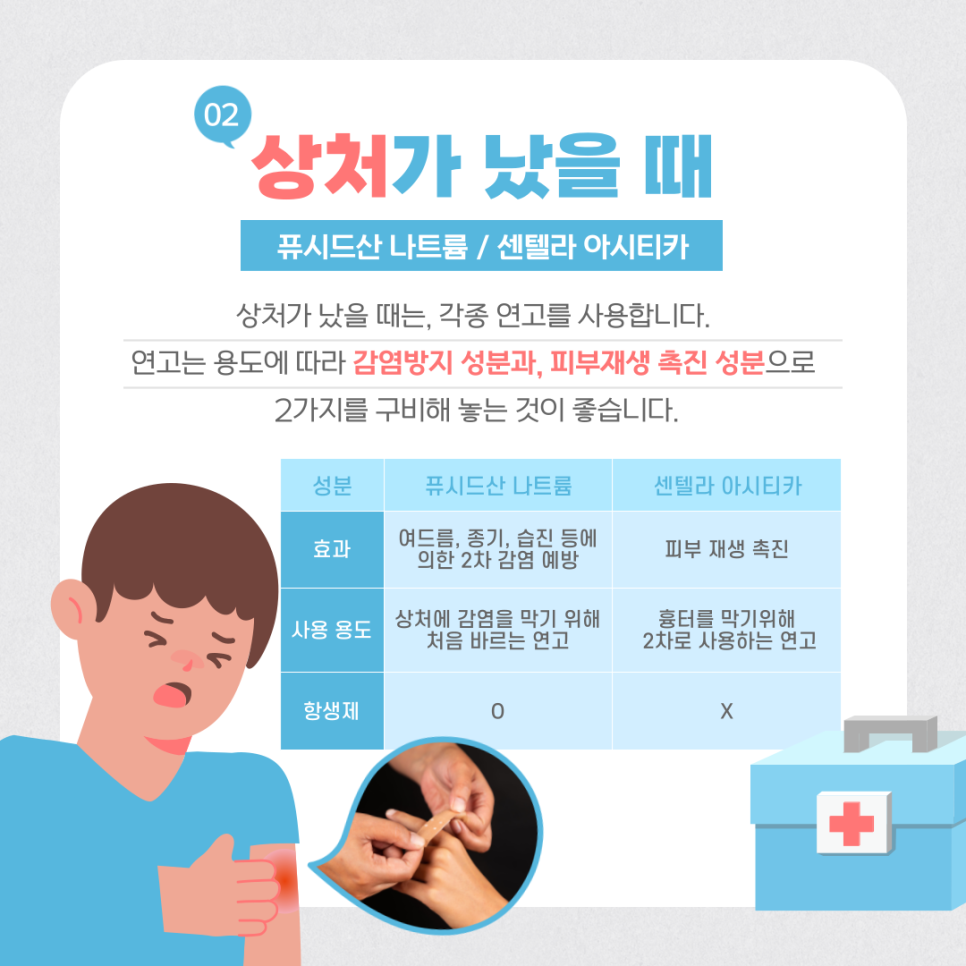 연고는 크게 감염방지(소독), 피부재생(치료)