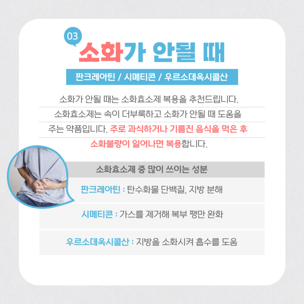 소화가 안 될 때는 소화효소제를 복용해주세요.