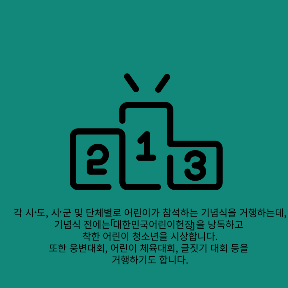 각 시 도. 시 군 및 단체별로 어린이가 참석하는 기념식을 거행하는데 기념식 전에는 대한민국 어린이헌장 을 낭독하고