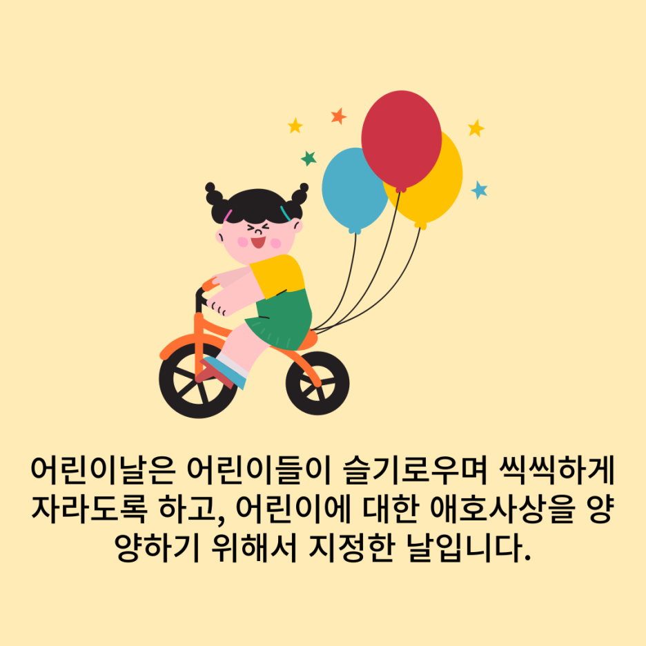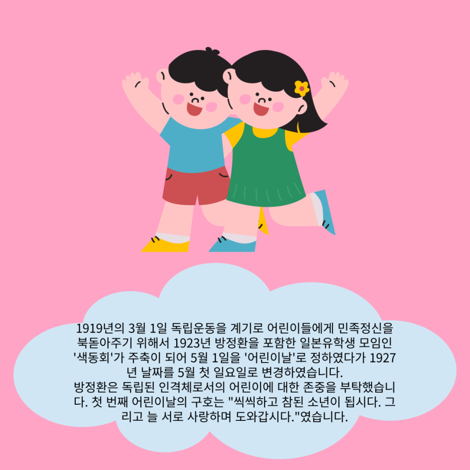 첫 번째 어린이날의 구호는 "씩씩하고 참된 소년이 됩시다. 그리고 늘 서로 사랑하며 도와갑시다." 였다고 하네용 ㅎㅎ