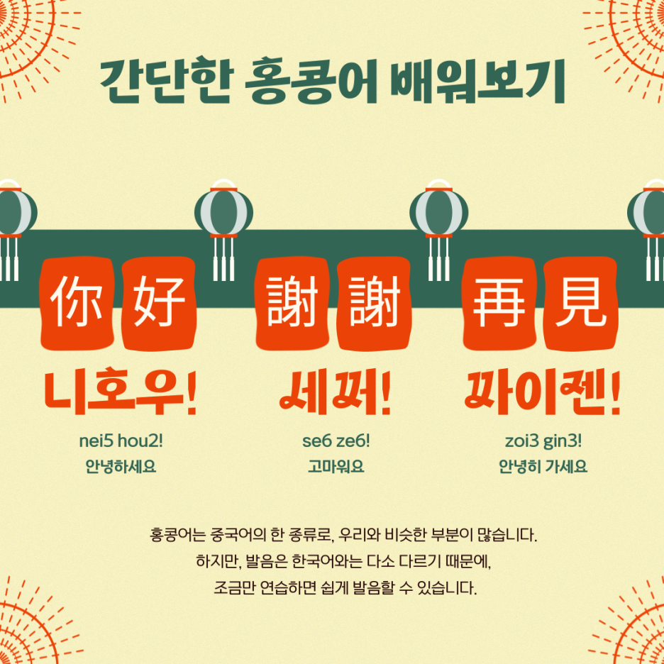 중국은 워낙 넓기 때문에 홍콩어(광둥어)를 사용하고 있는데요!