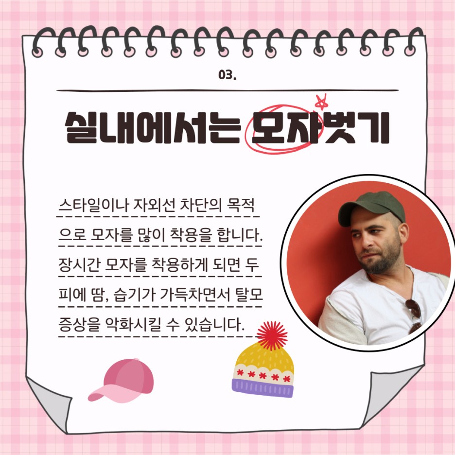 장시간동안 모자를 쓰게되면 두피에 땀과 습기가 가득차면서