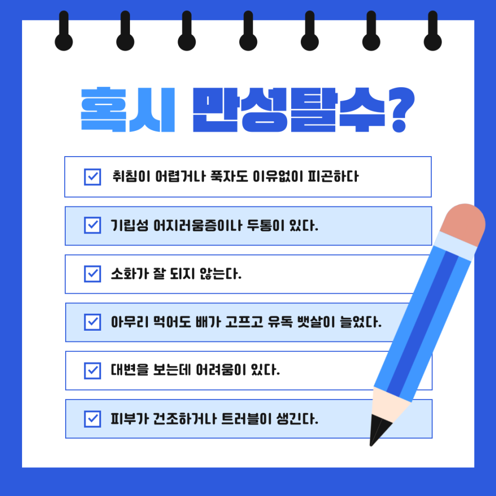 위 체크리스트를 확인해보시고, 수분 섭취를 점검해보세요~!~!