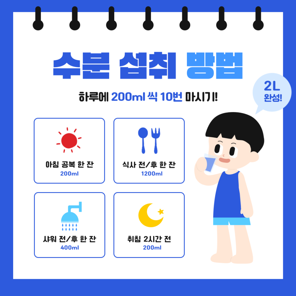 이렇게 하루 2리터 정도의 물을 목표로 수분을 섭취하는 것이 좋아요! 💧