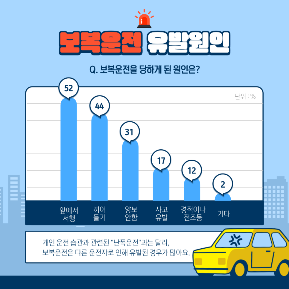 최근 조사에 따르면, 보복운전의 가장 큰 원인은 '앞에서 서행하는 것'(52%)이래요!