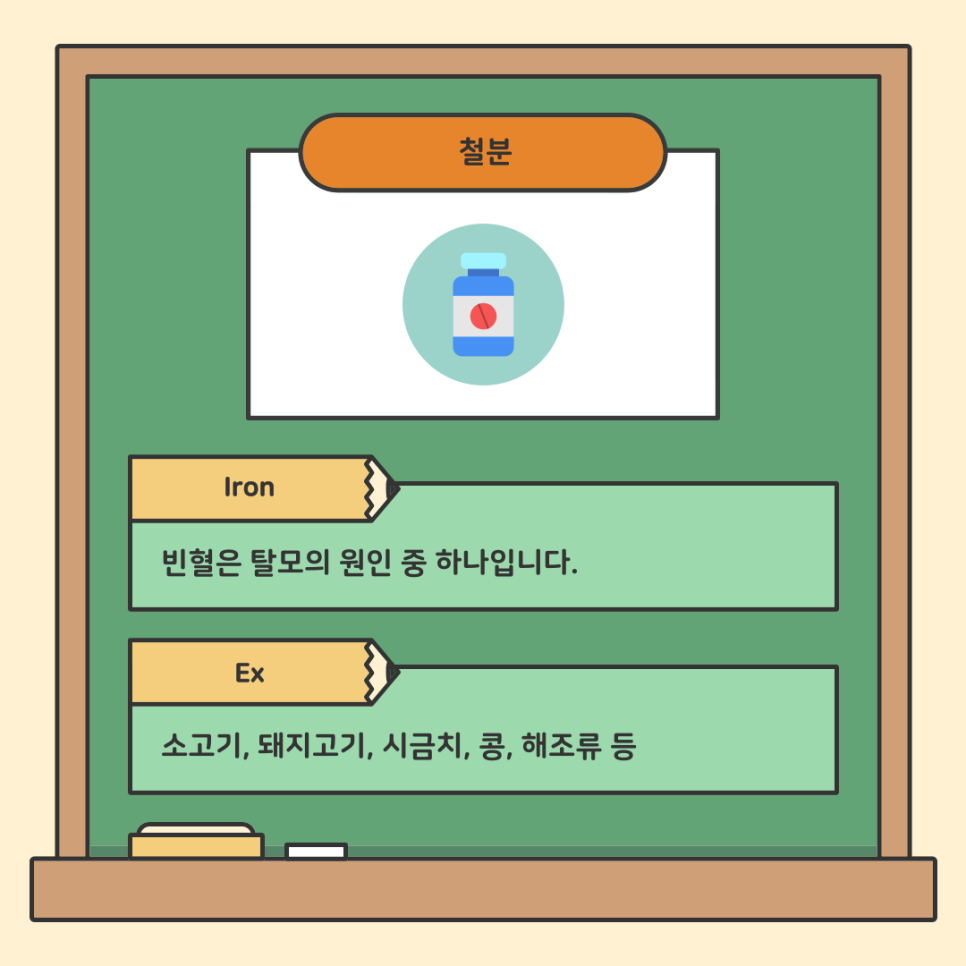 철분: 빈혈이 탈모의 원인 중 하나라는 거 아셨나요? 철분이 풍부한 음식을 먹어야 해요.