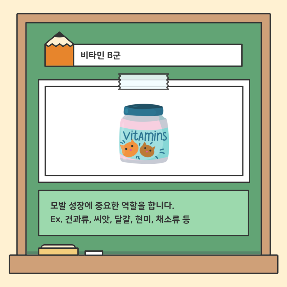 비타민 B군: 모발이 잘 자라도록 도와주는 필수 성분이에요!