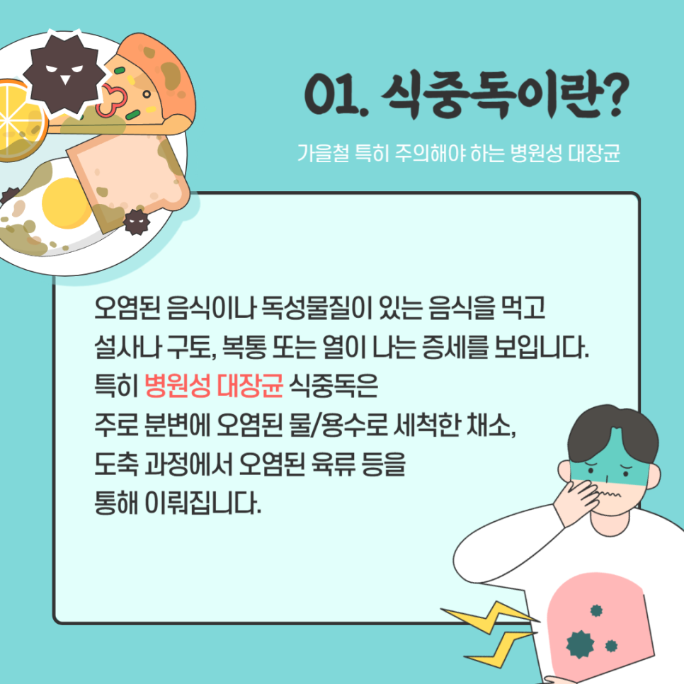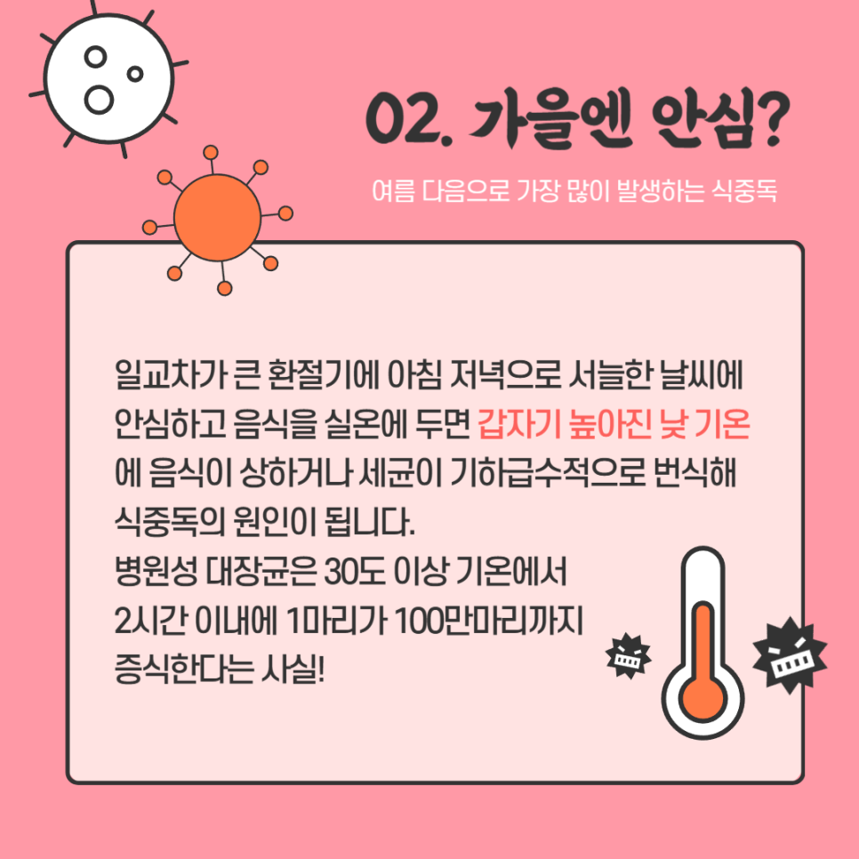가을철은 일교차가 크고 기온이 변화무쌍해 식중독 위험이 높은 시기랍니다. 🍂