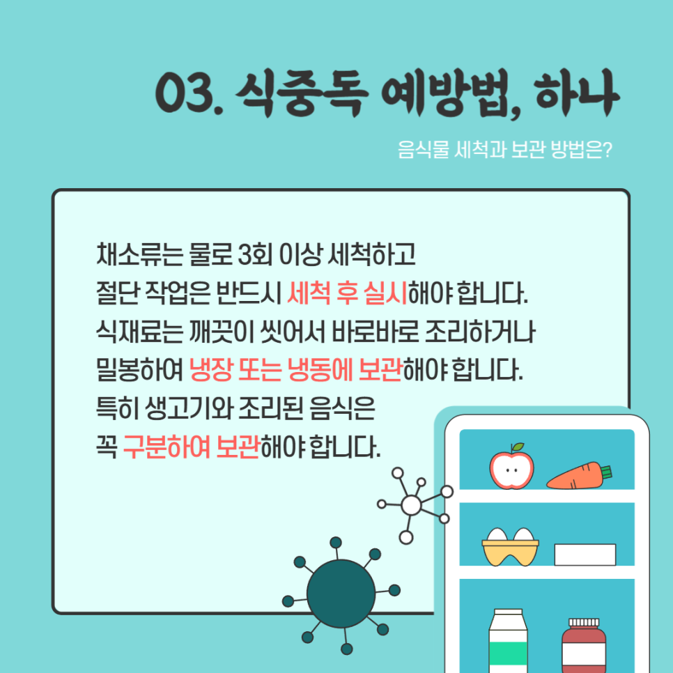 음식물 세척과 보관을 철저히 해야 해요! 💦