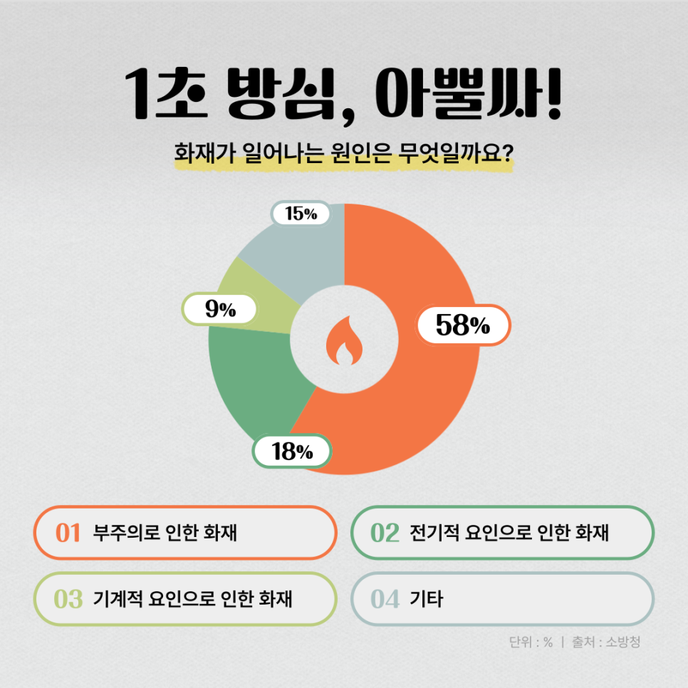 소방청 통계에 따르면, 화재의 58%가 부주의로 발생한대요!