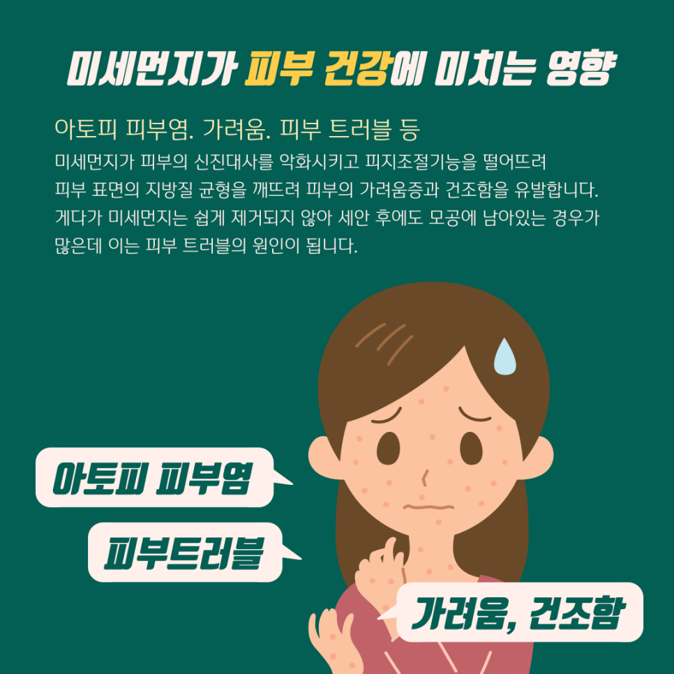마지막으로, 미세먼지는 피부 건강에도 악영향을 미쳐요.