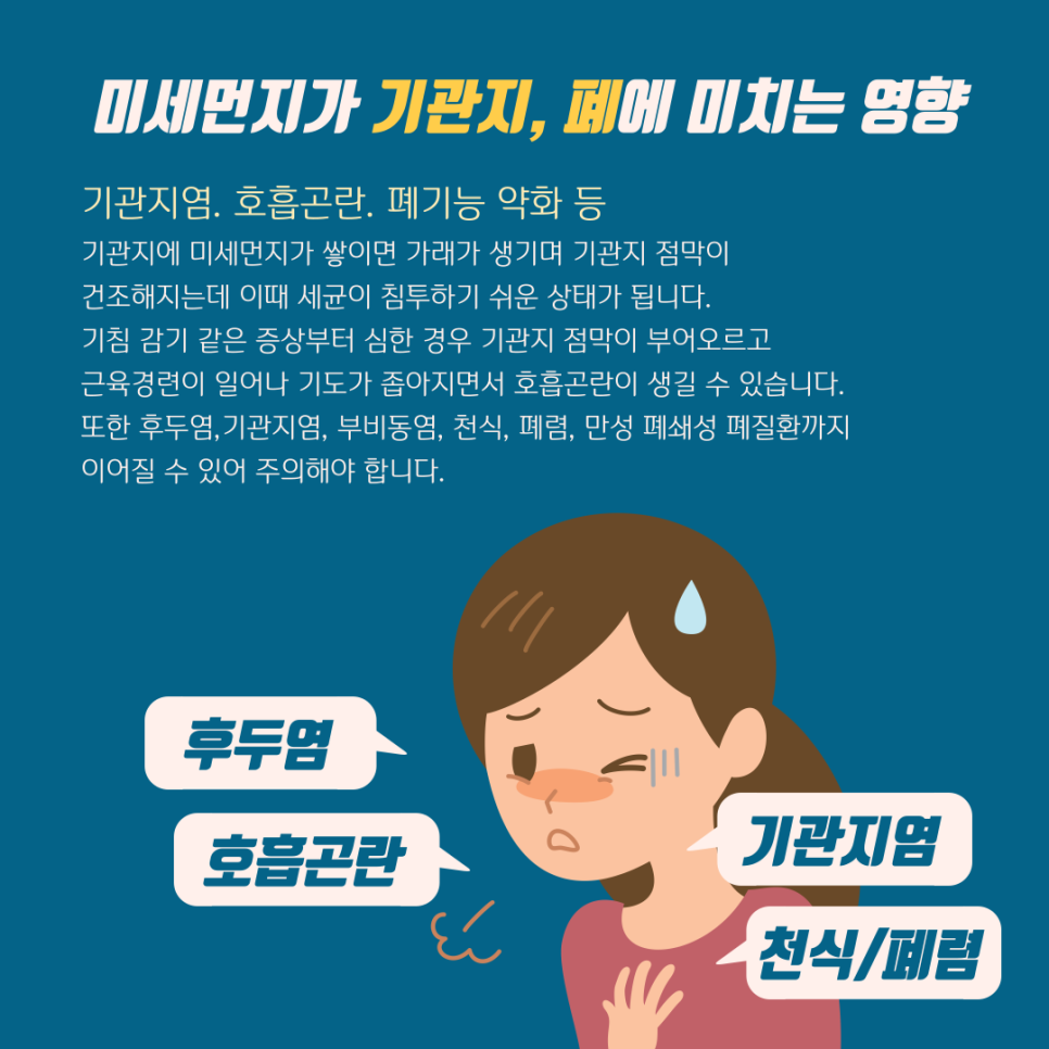 미세먼지는 호흡기 건강에 가장 큰 영향을 미치는 주범이에요.