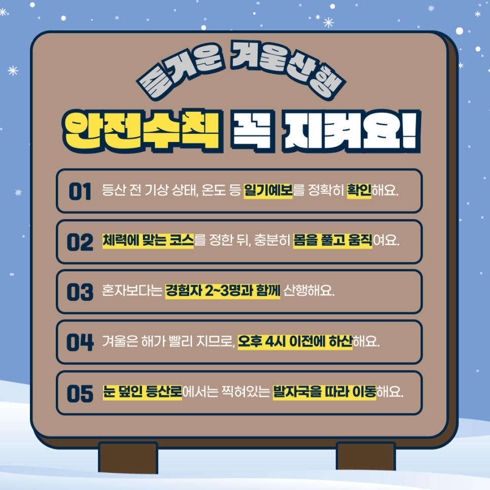 겨울 산행 시에는 다섯 가지 안전 수칙을 지켜주세요.