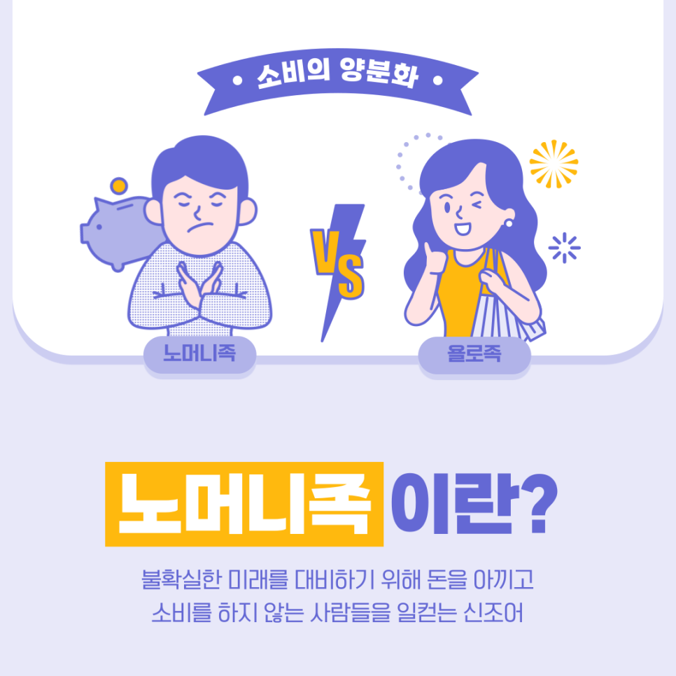 노머니족은 불확실한 미래에 대비하기 위해 소비를 줄이고 돈을 아끼는 사람들을 말해요. 💳❌