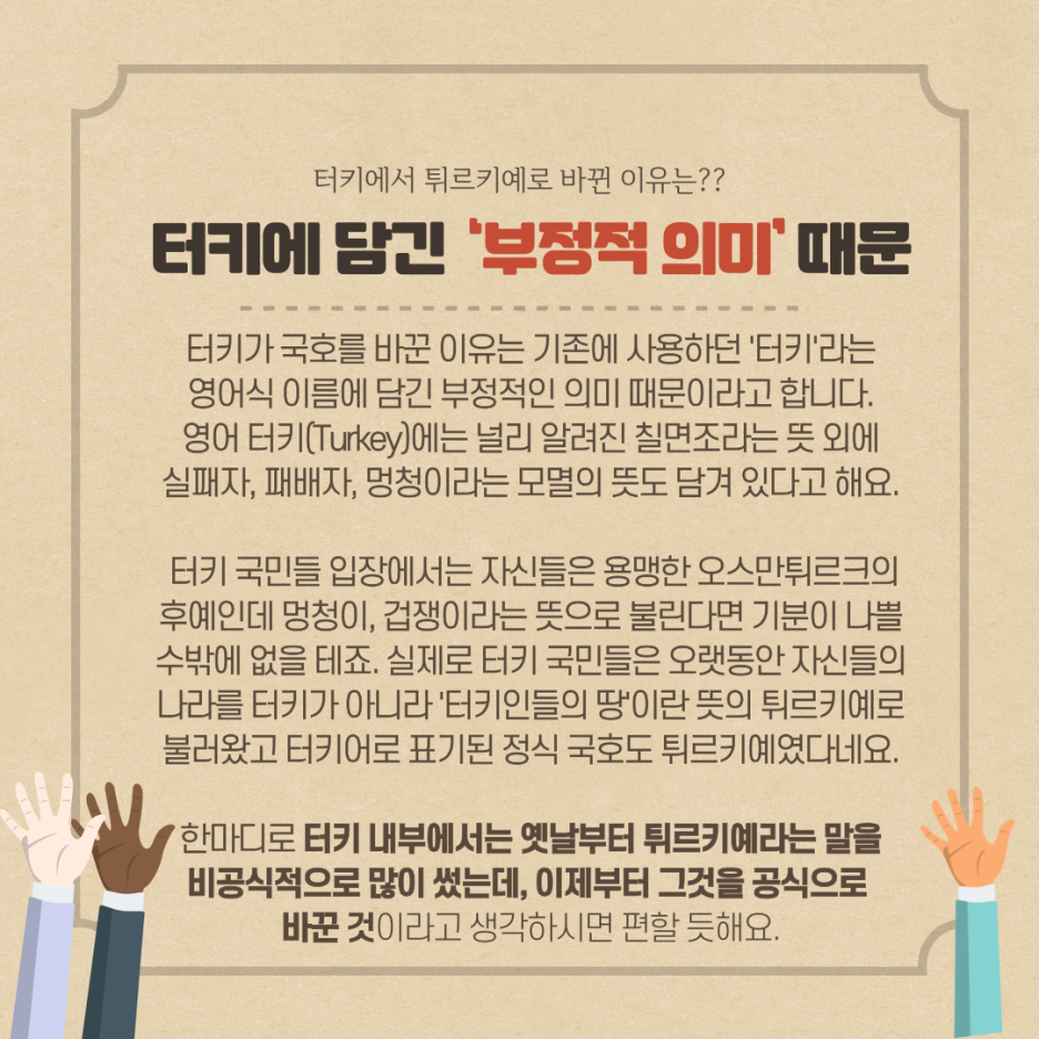 이렇듯, 우리와 밀접한 연관을 맺어온 터키가 튀르키예로